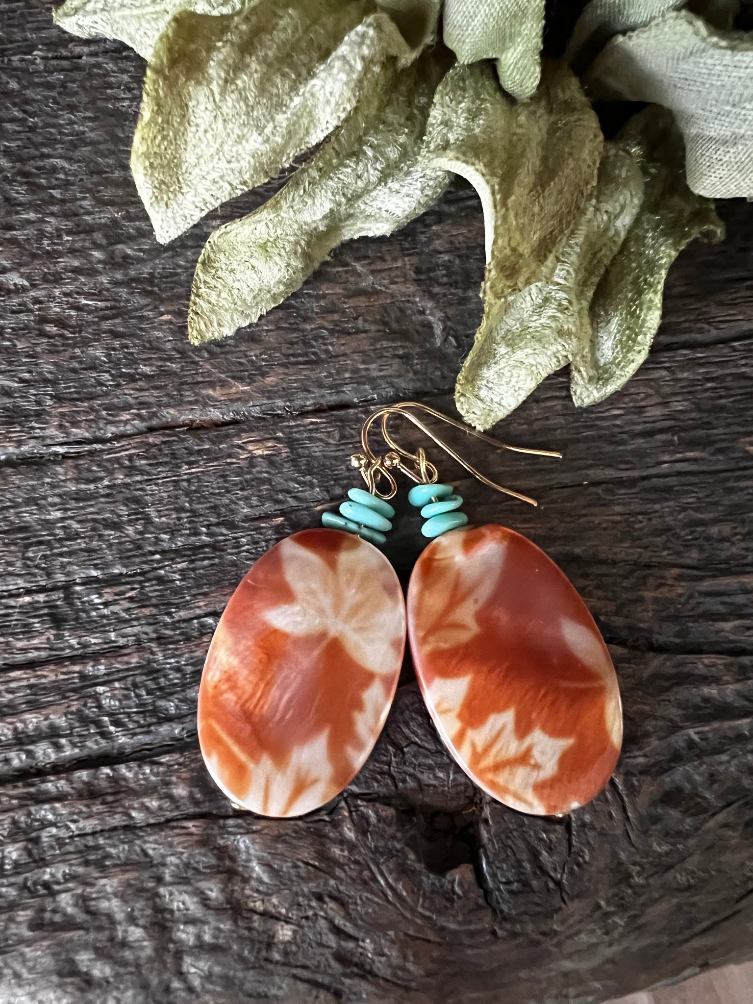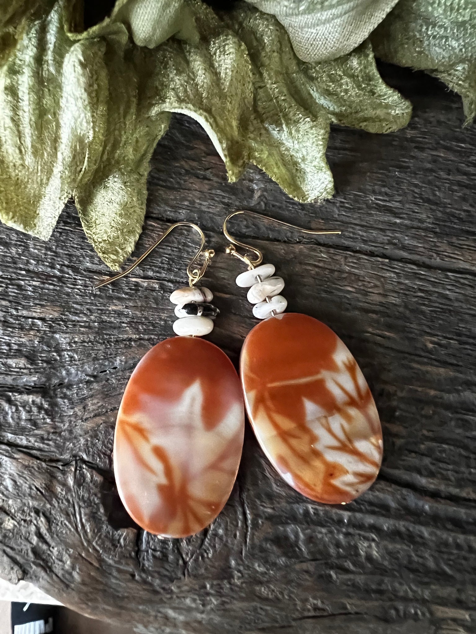 Beautiful acrylic with leave patterns with either white buffalo stone or natural turquoise. Brass ear wires