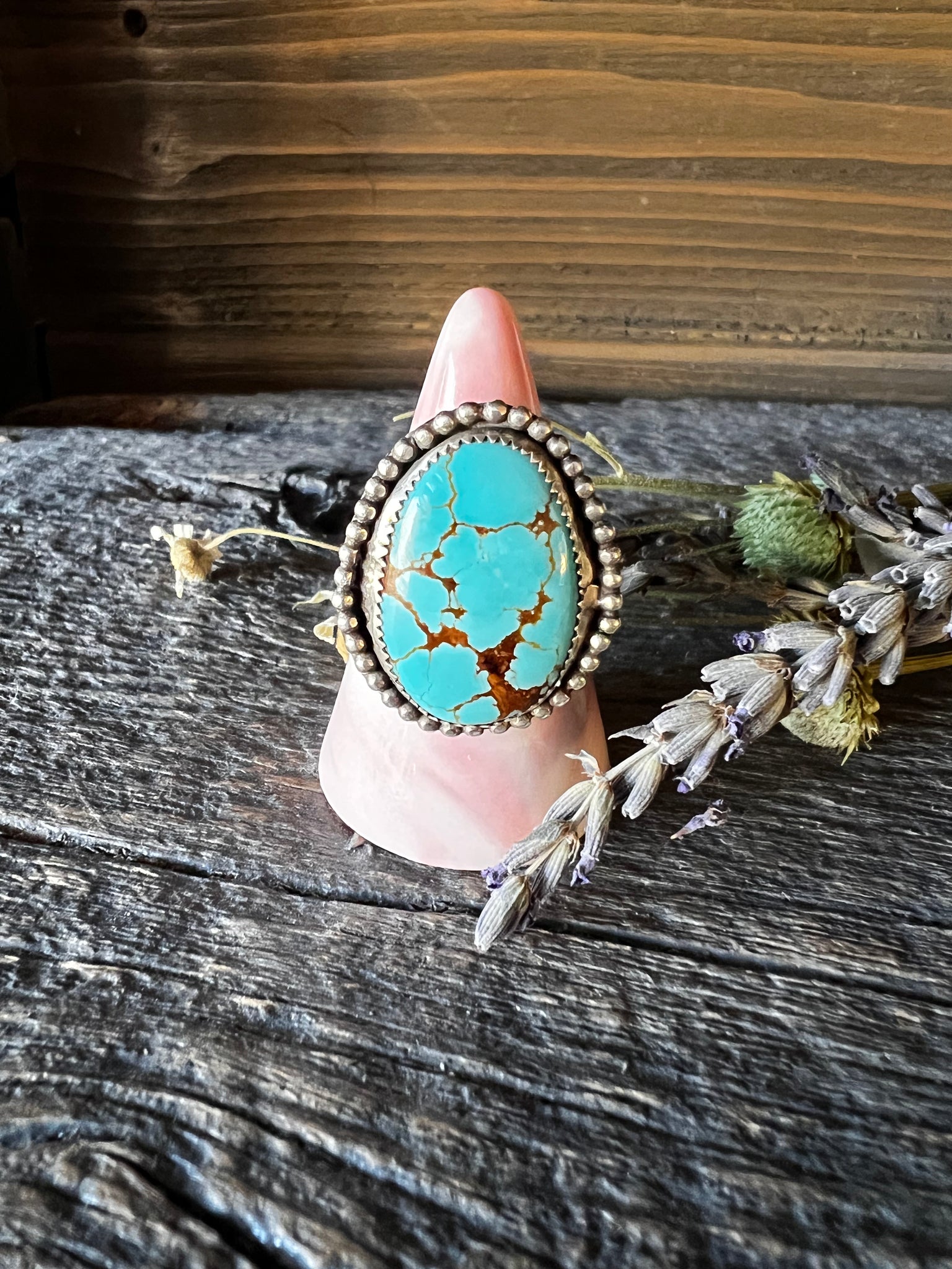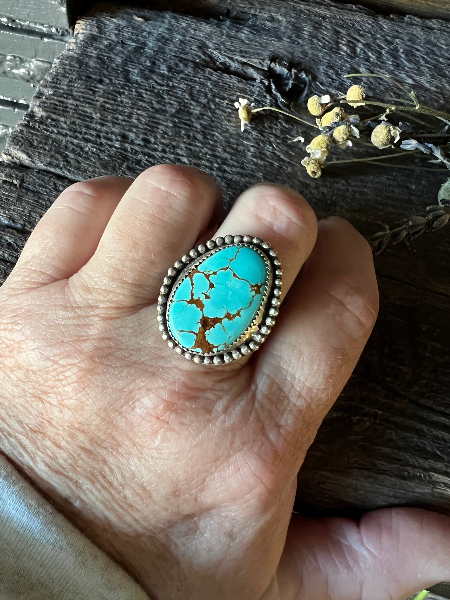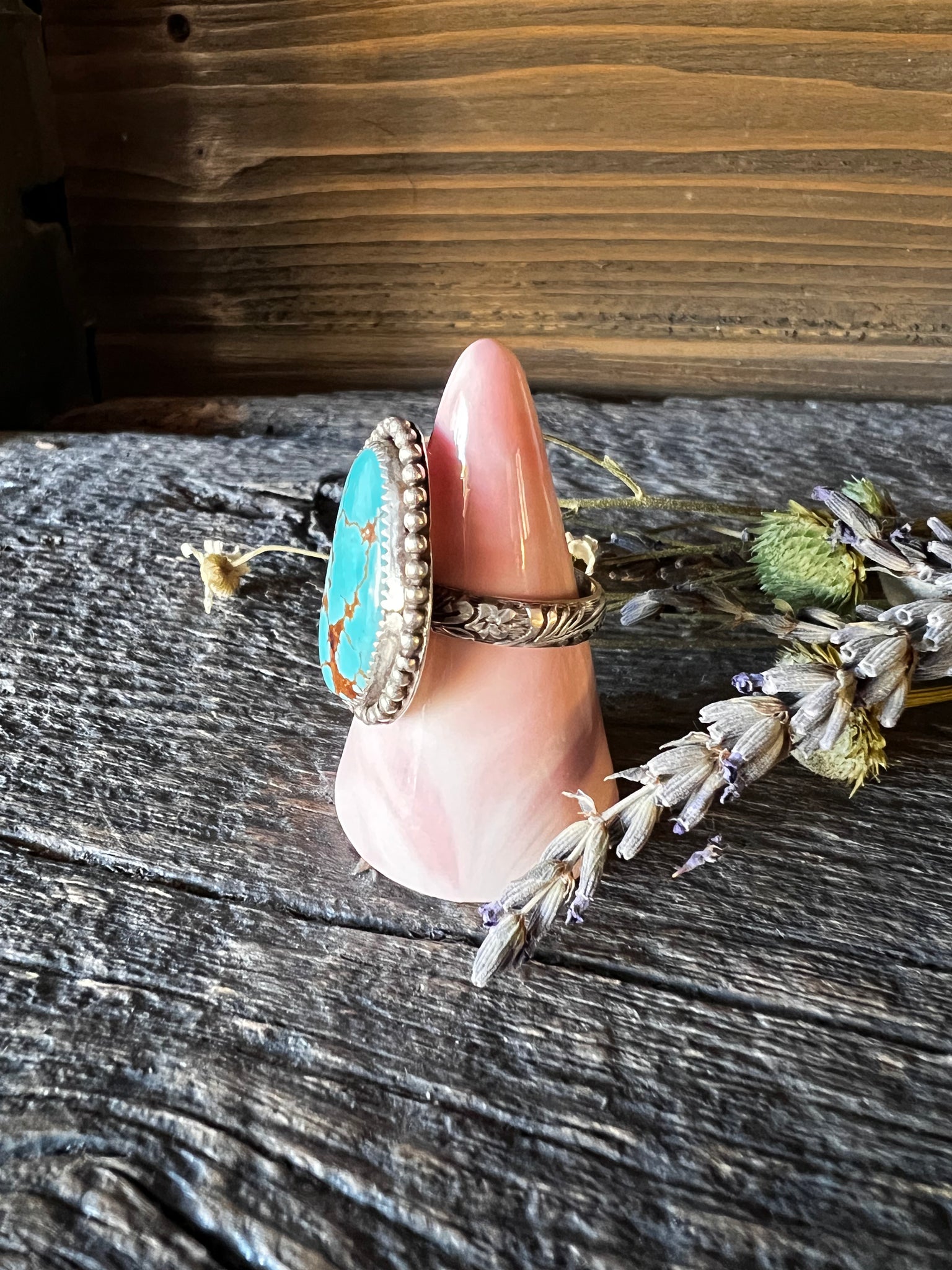 Big beautiful piece of number eight turquoise with beautiful beaded trim and patterned band. All Sterling silver size 8.75.