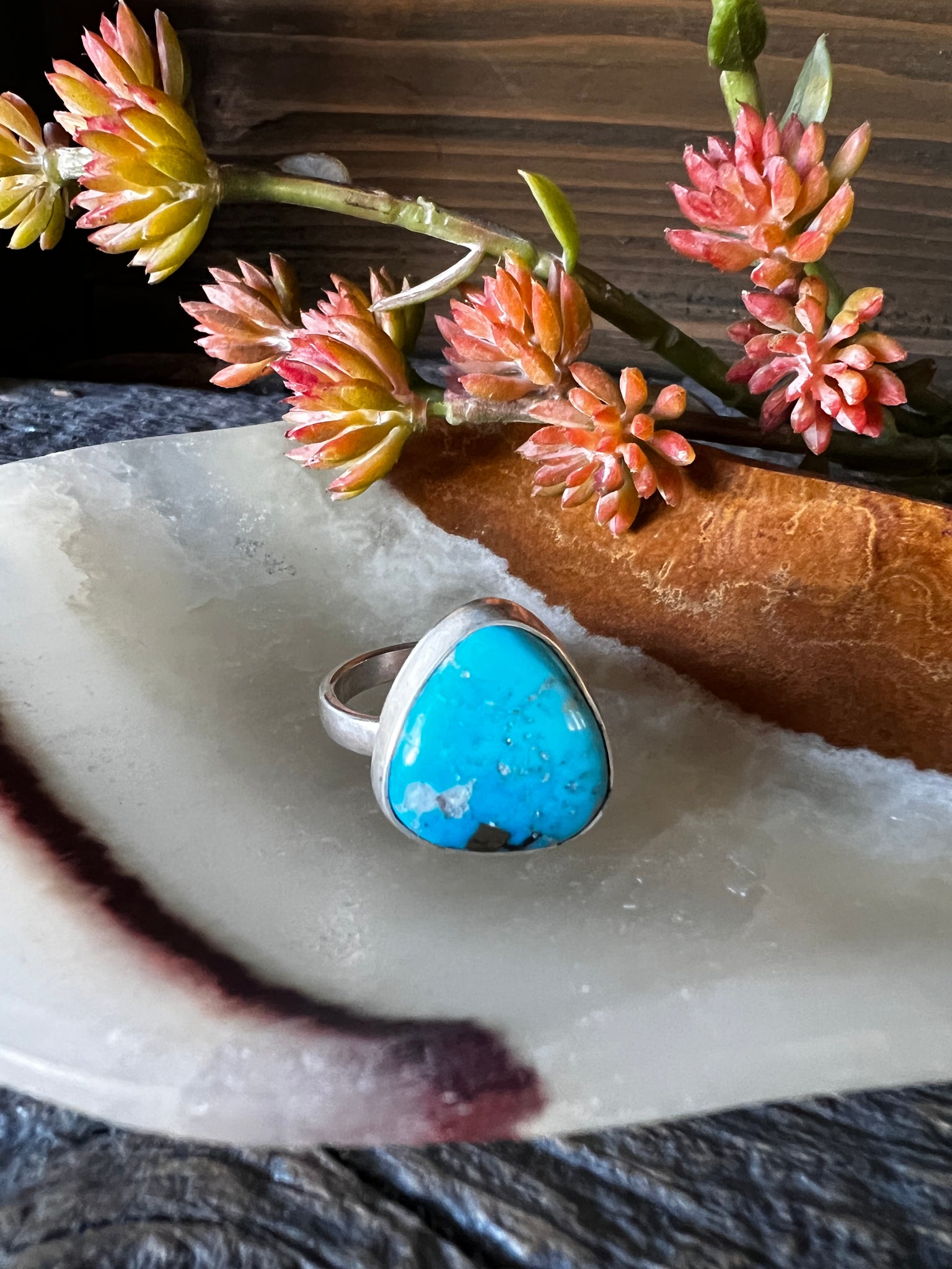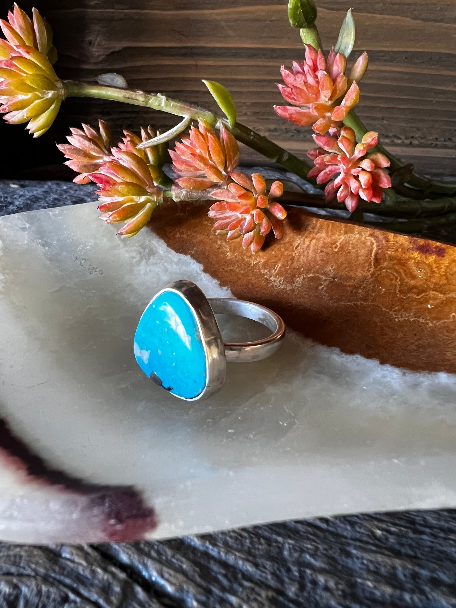 Beautiful piece of blue bandits turquoise with a little bit of pyrite in it. All Sterling silver size 9.5.
