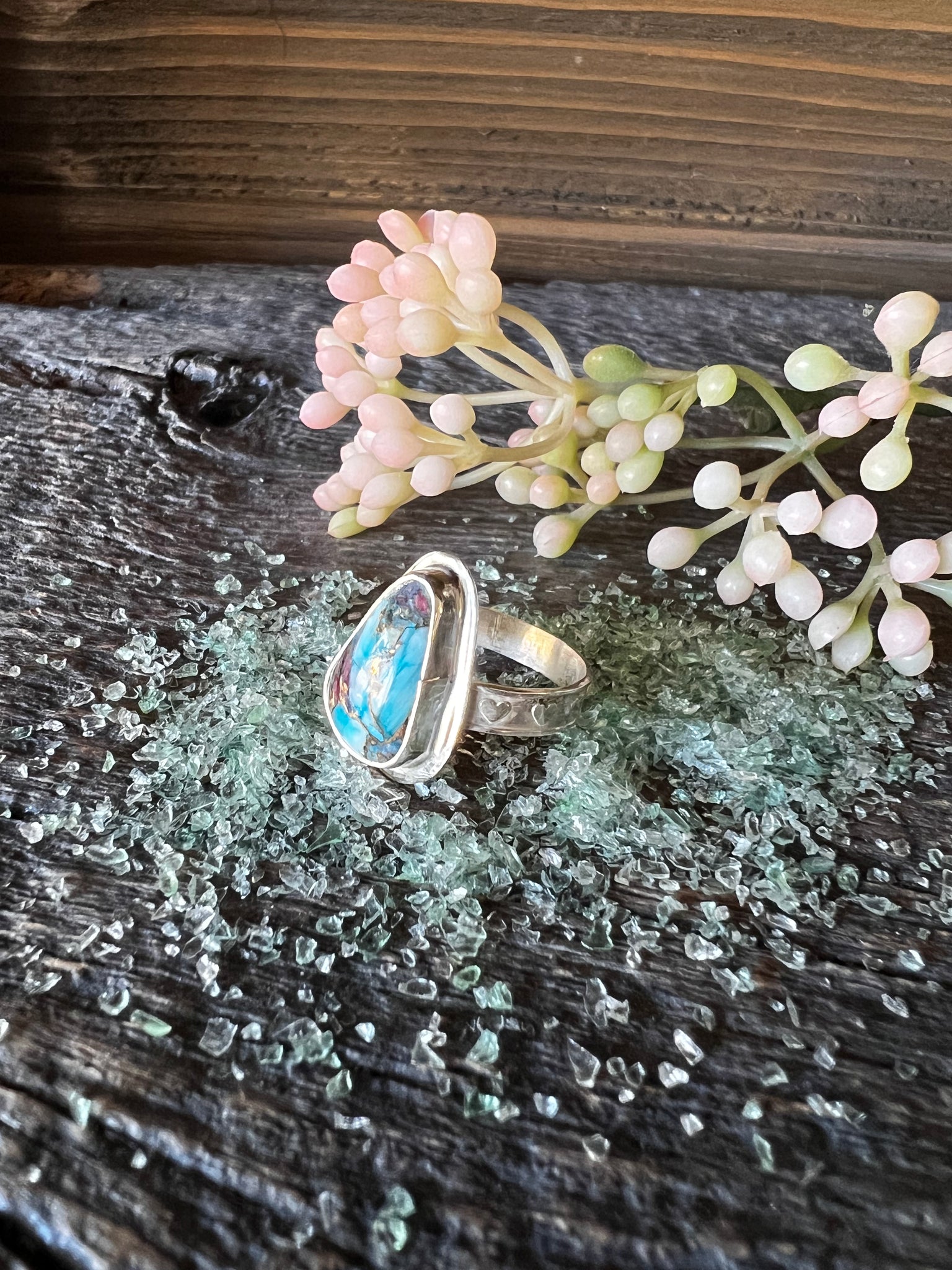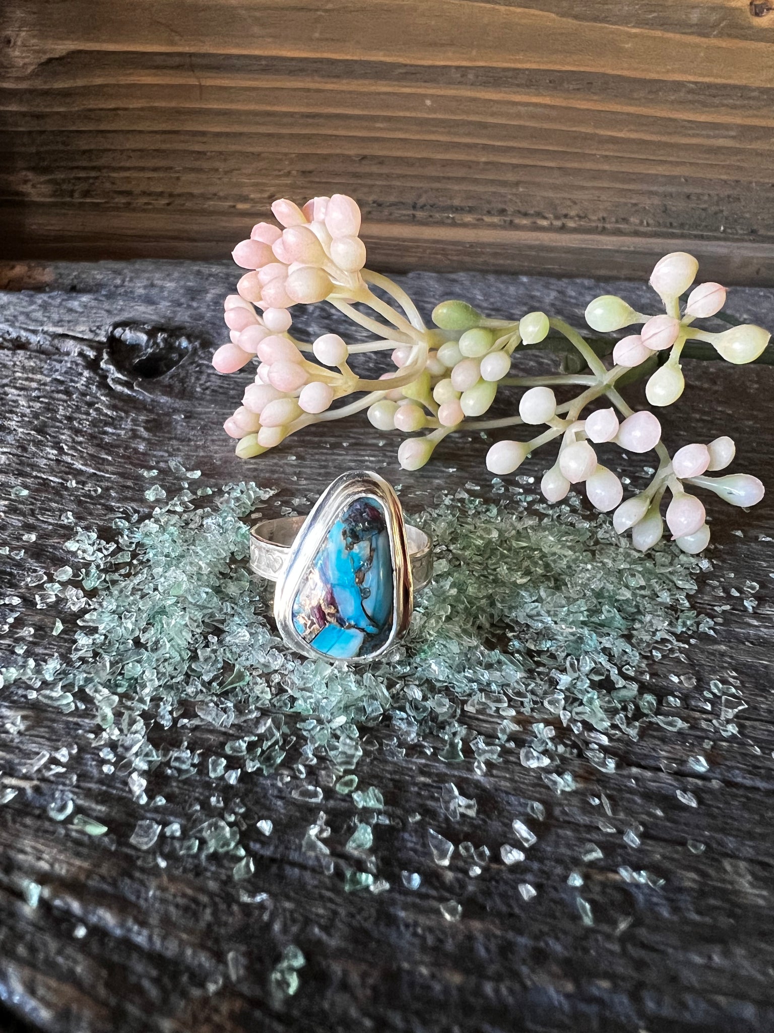 This beautiful composite stone has blue, purple and bronze in it. Sterling Silver, size 9