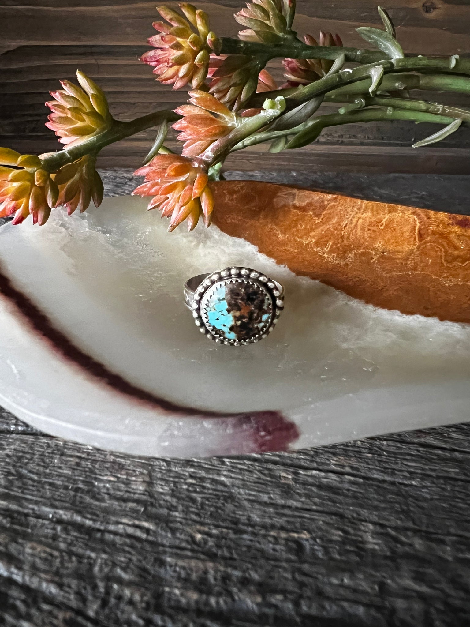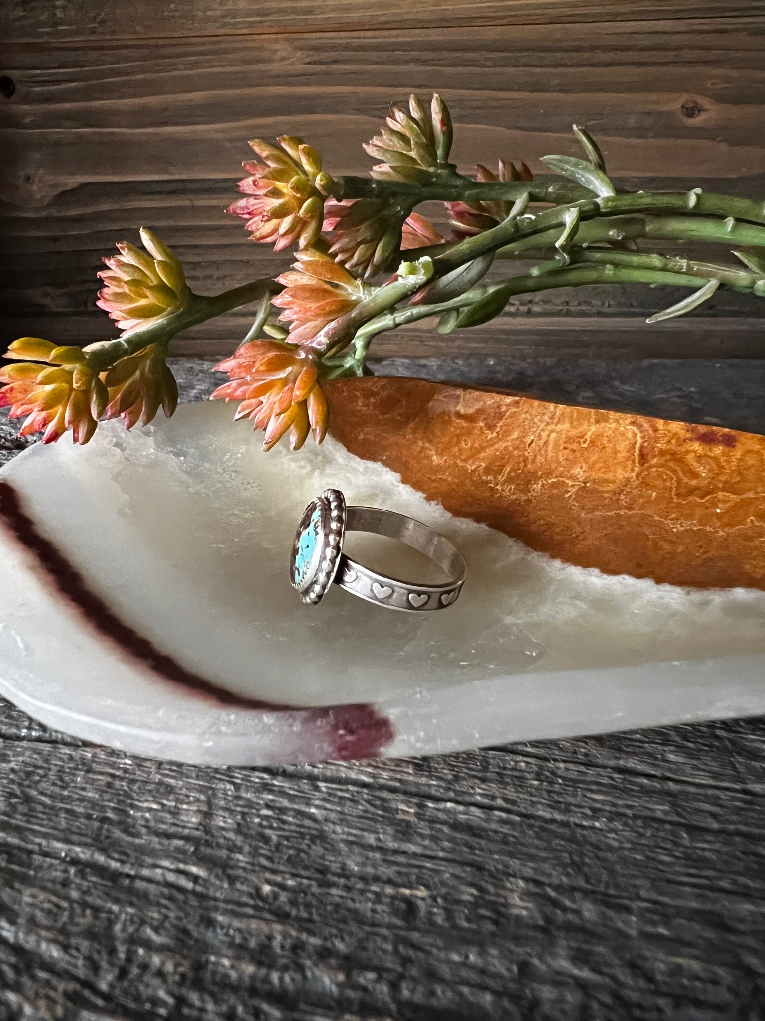 Royston  turquoise for this cute little round ring with sterling silver beaded trim. And a cute little heart band. Size 8.