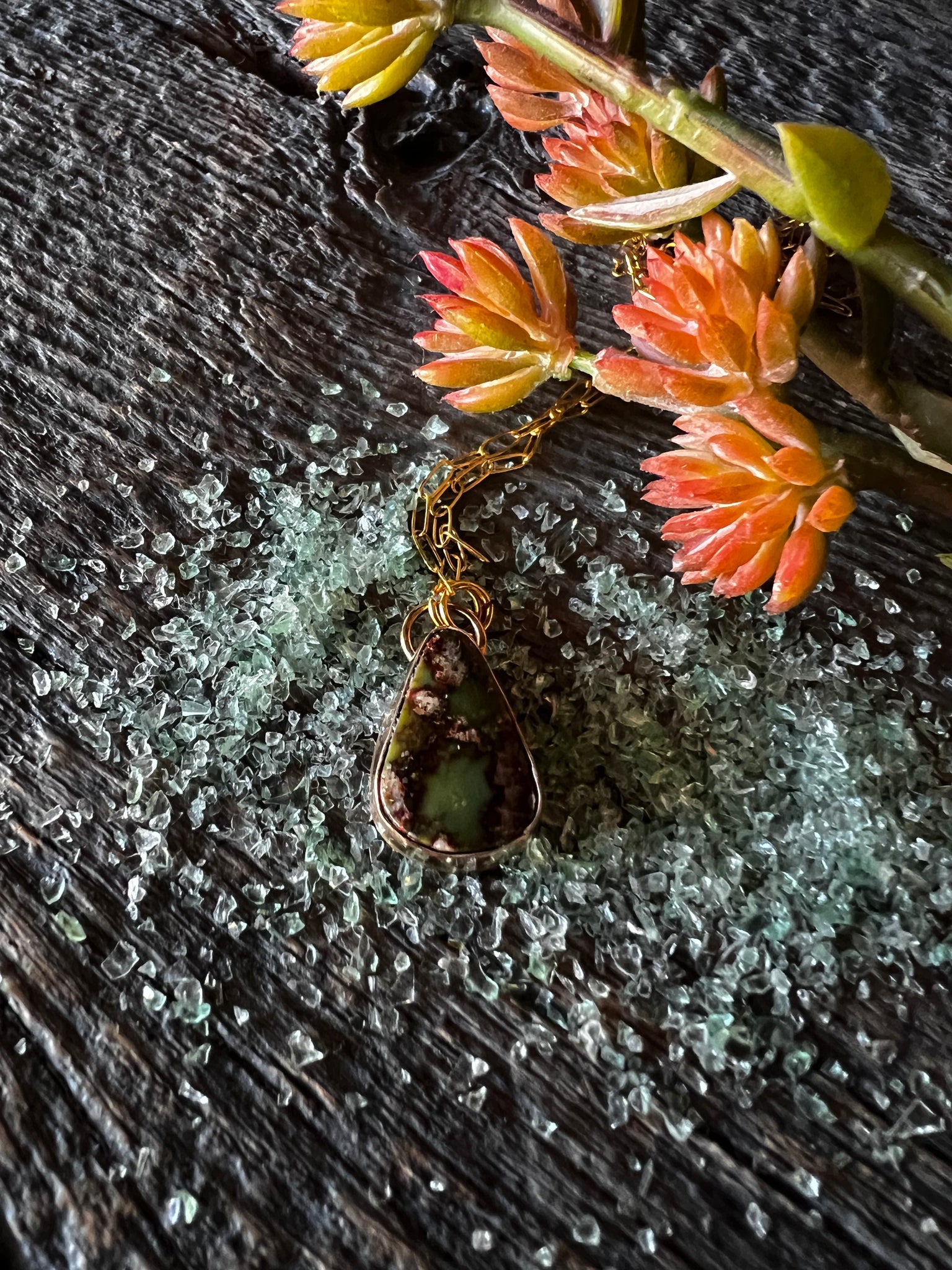 Beautiful warm green turquoise, set in brass with a gold filled 18in chain
